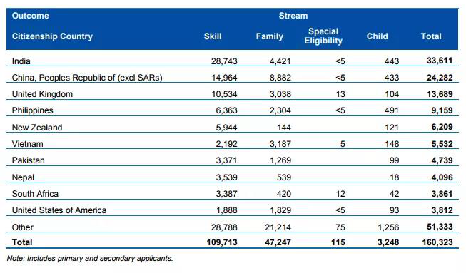 2018-19財(cái)年澳洲總共發(fā)出160,323個(gè)永居簽證,同比2017-18財(cái)年減少了2094個(gè);