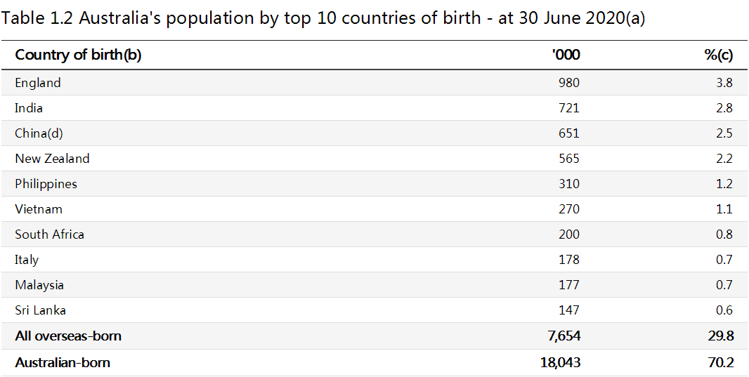 根據(jù)澳大利亞統(tǒng)計(jì)局發(fā)布的最新《澳洲人口統(tǒng)計(jì)》報(bào)告顯示,截至2020年6月30日,澳洲中國移民的數(shù)量達(dá)到了65萬,是澳洲移民第三大來源國。