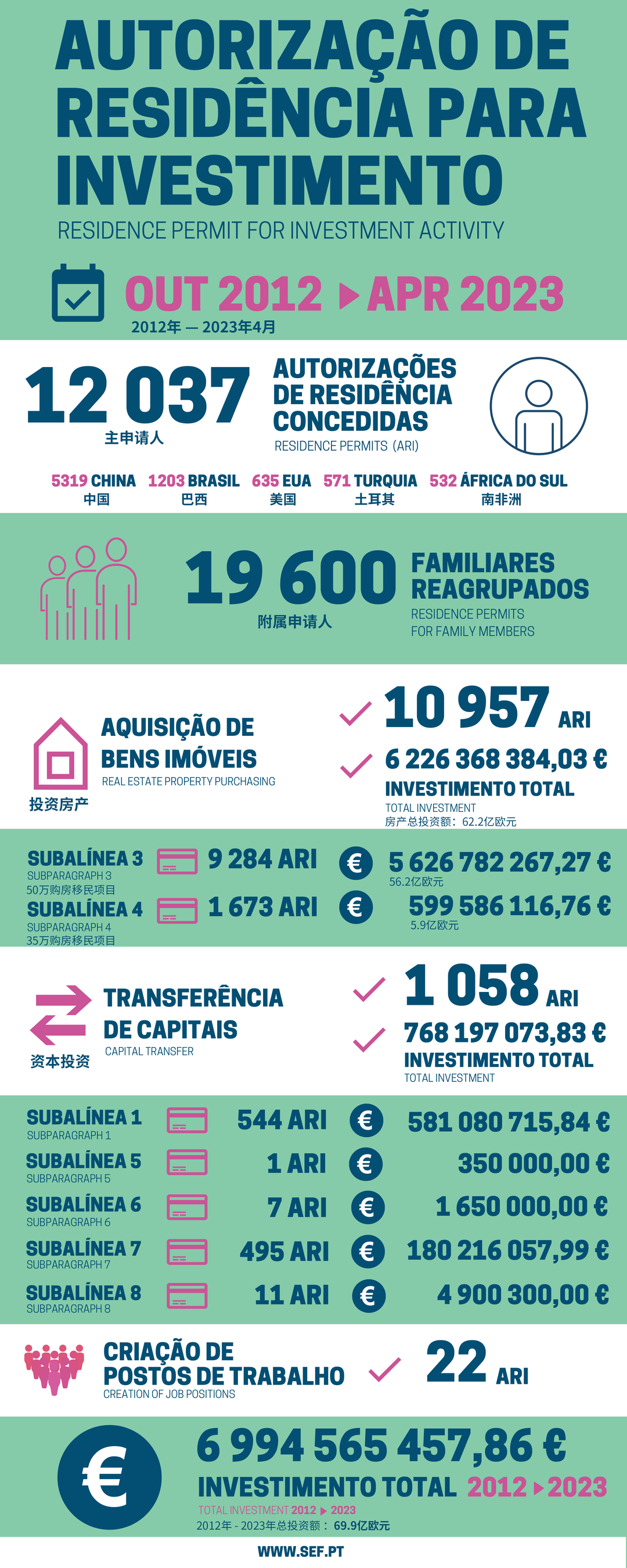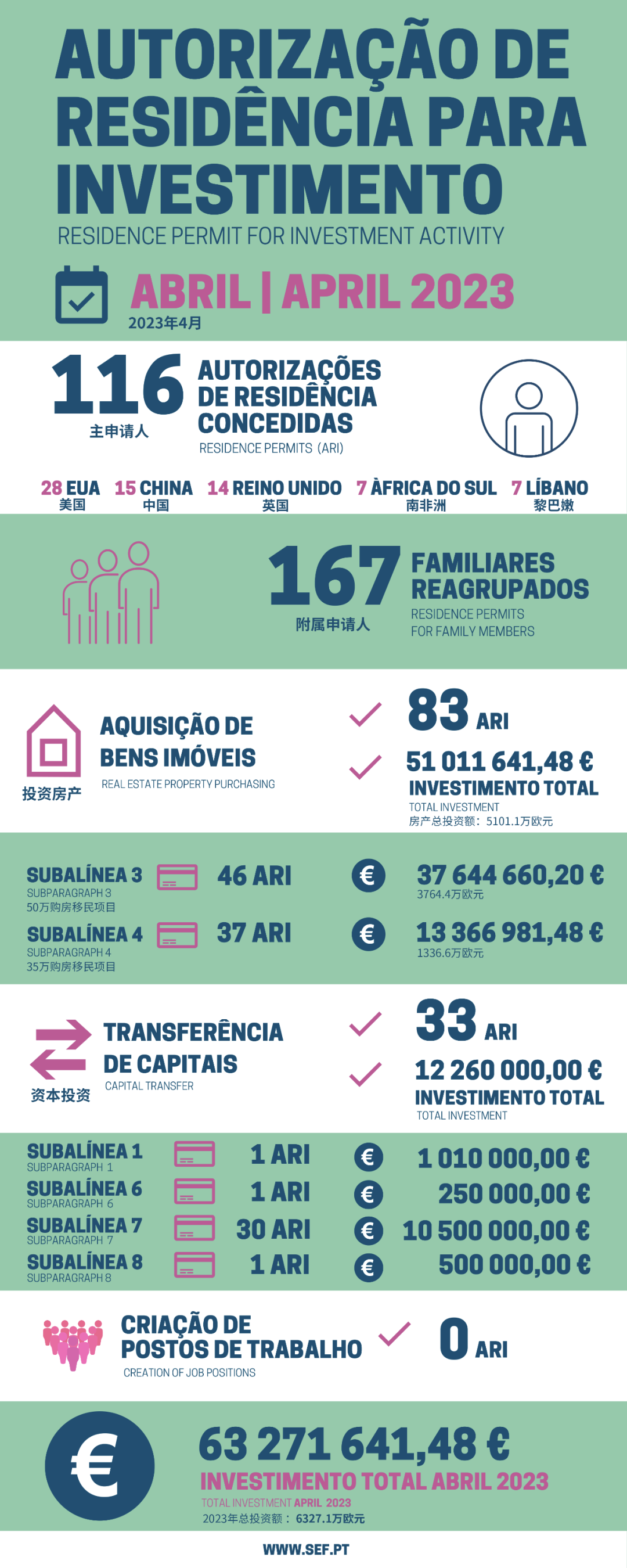 近日,葡萄牙移民局(SEF)正式發(fā)布了4月的黃金簽證最新統(tǒng)計(jì)數(shù)據(jù)。4月共有116位主申請(qǐng)人和167位附屬申請(qǐng)人獲批葡萄牙黃金簽證。獲批總?cè)藬?shù)為283人,總投資額約6327萬歐元。