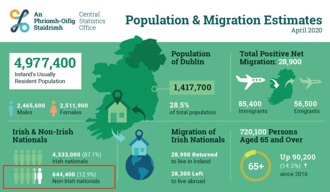 據愛爾蘭中央統計局發布的最新數據,截至2020年4月,愛爾蘭共有498萬居民,其中外國移民增至64.44萬人,占愛爾蘭總人口的12.9%。