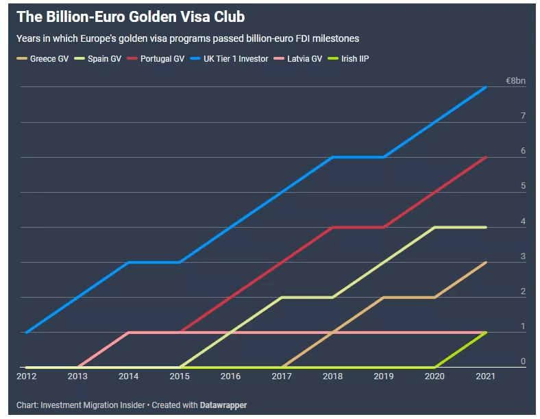 2021年,除英國外,葡萄牙、希臘、愛爾蘭黃金簽證都有重大突破。葡萄牙籌集到的外國直接投資突破了60億歐元;希臘黃金簽證有望突破30億歐元;移民后起之秀愛爾蘭則首次突破10億歐元。