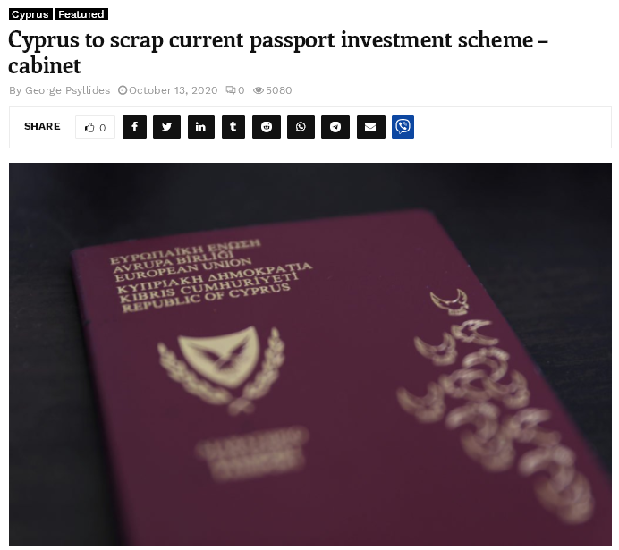當地時間10月13日,據塞浦路斯郵報消息,塞浦路斯將廢除目前的護照投資項目。