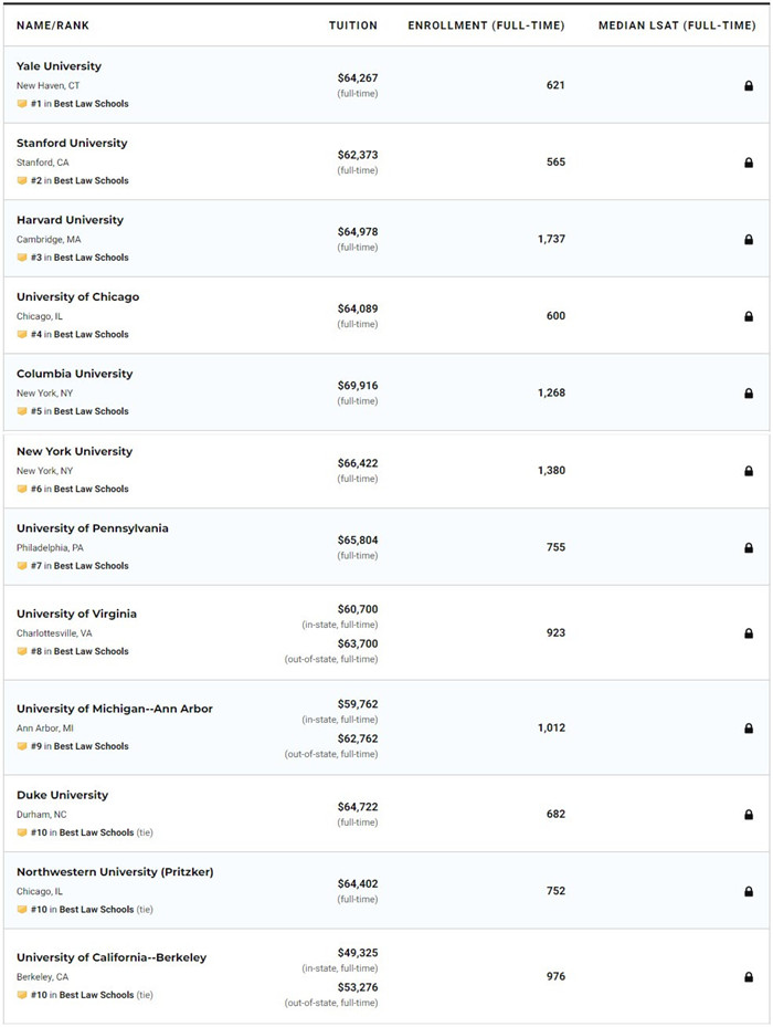 另外,最近幾年美國法學院入學率很低,有興趣的學生可以考慮。TOP10具體排名如下: