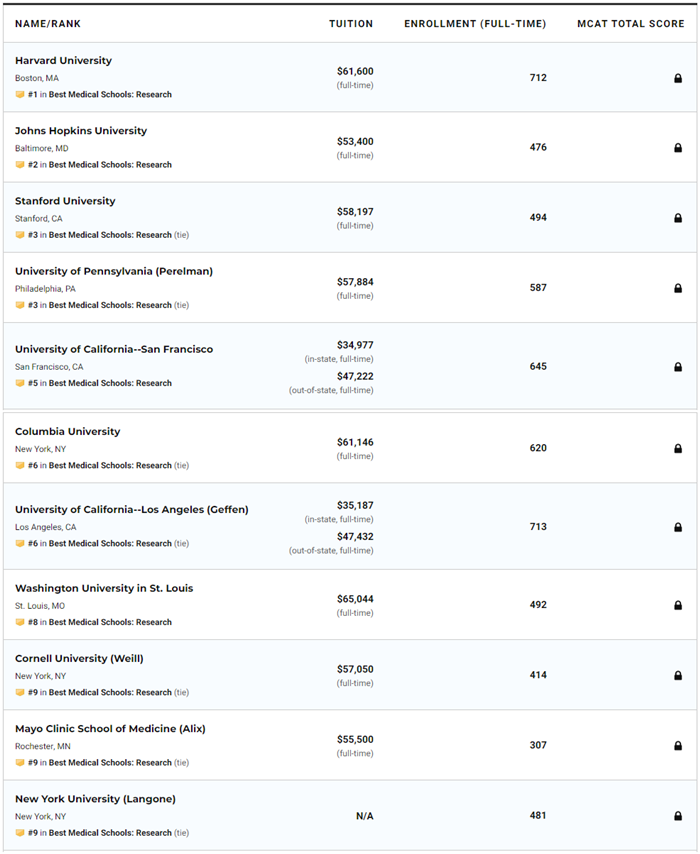 不過,不管是醫學,還是護理,國際生都不多。不是每所醫學院都招國際生(有綠卡的孩子就沒有這層顧忌),部分醫學院可能只有一兩個方向對留學生開放。下面是Research方向的TOP10排名: