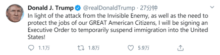 特朗普在推特上寫道,“鑒于‘這個看不見的敵人’(指新冠病毒)的攻擊,以及保護我們偉大的美國公民的工作需要,我將簽署一項行政命令,暫停移民入境美國!”