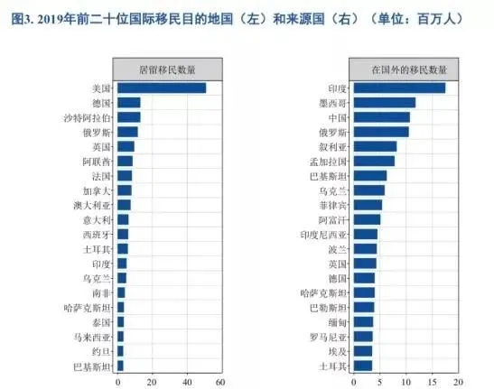 根據(jù)報告,印度仍是國際移民的最大來源國,居住于國外的印度移民人數(shù)為1750萬。其次是墨西哥和中國,分別為1180萬和1070萬。自1970年以來,美國一直是國際移民的主要目的地國,移民數(shù)量從當(dāng)年的不足1200萬增至2019年的5070萬。其次是德國、沙特阿拉伯、俄羅斯和英國。