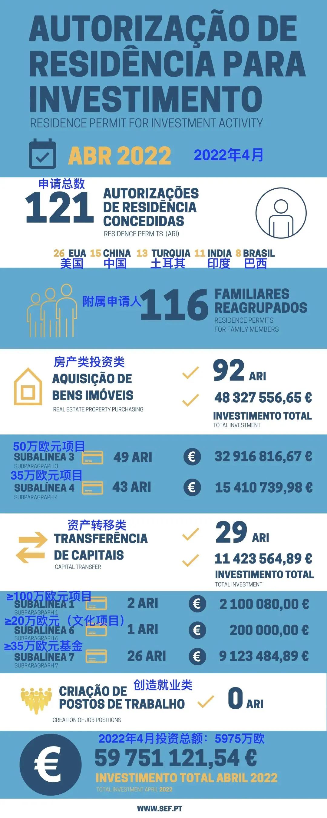 葡萄牙移民局(SEF)日前公布了2022年4月的黃金簽證數(shù)據(jù)。4月,共有121位主申請人及其116位家庭附屬申請人獲批黃金簽證。