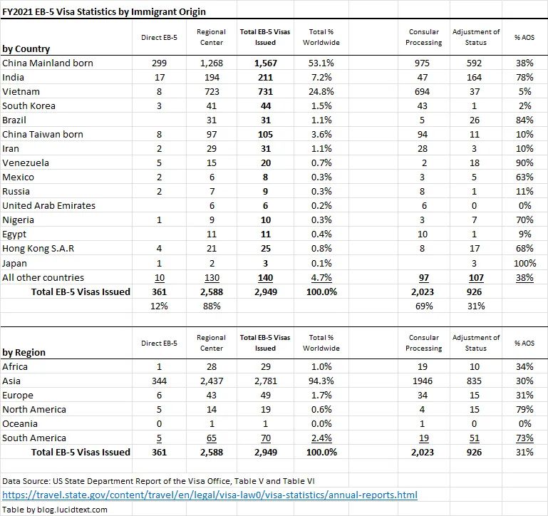 ①2021財年,全年共發(fā)放2949張EB-5簽證,其中926張來自于移民局,2023張來自于各國使領(lǐng)館;