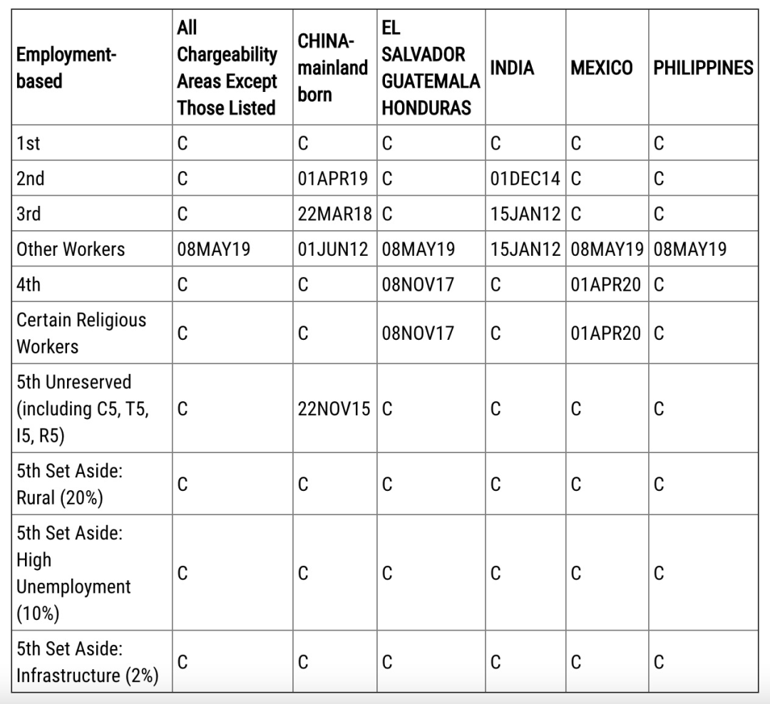 ·表B同樣除EB-2前進(jìn)1個(gè)月至2019年5月1日,其他各類簽證項(xiàng)目排期無(wú)變化。