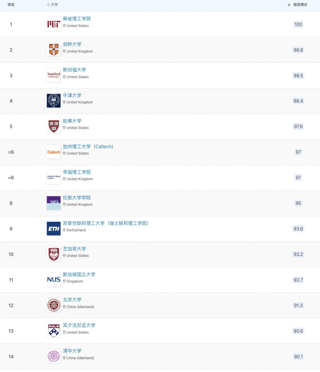 以下為世界前100所大學(xué)排名: