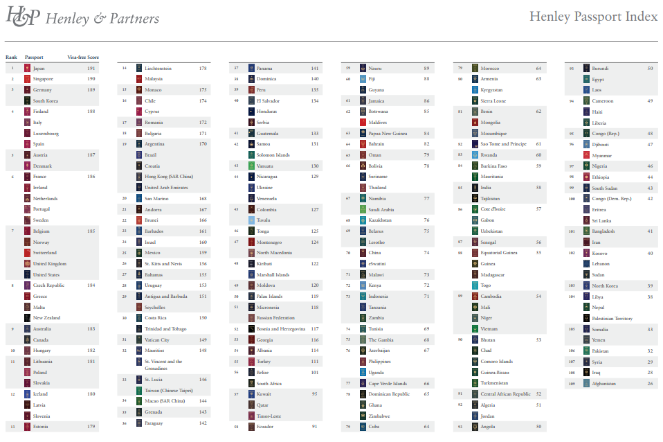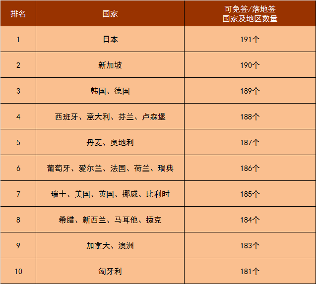 7月7日,亨氏護(hù)照指數(shù)(Henley Passport Index)公布了世界最強(qiáng)護(hù)照最新一季的排行榜:日本蟬聯(lián)第一(可自由通行191個(gè)國家及地區(qū)),新加坡排名第二(可自由通行190個(gè)目的地),韓國、德國排名第三(可自由通行189個(gè)目的地)。